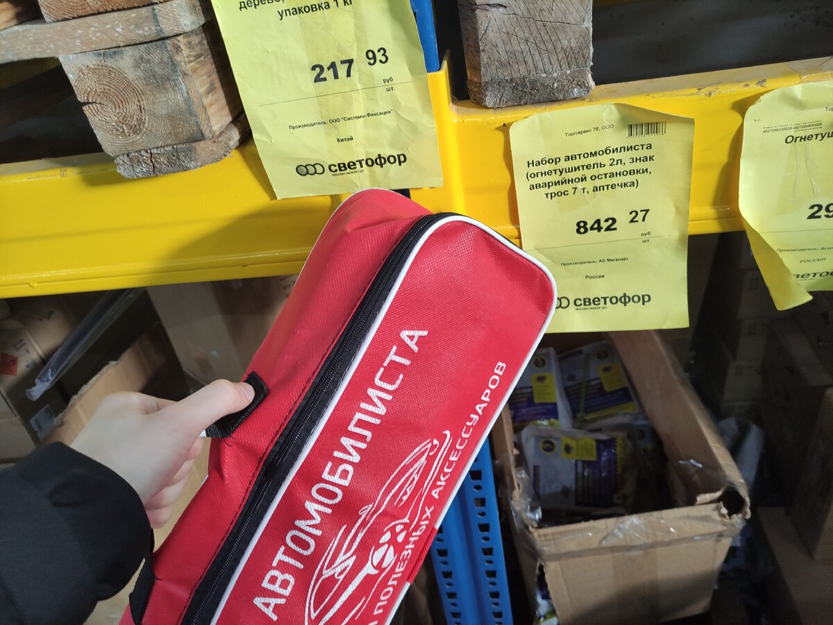Отличный набор, который вмещает в себя: огнетушитель 2 литра, знак аварийной остановки, трос 7т, аптечка. В наборе есть все то, что необходимо возить с собой в автомобиле. Стоит недорого, а качество всех предметов, которые находятся внутри- отличное. Сделано в России