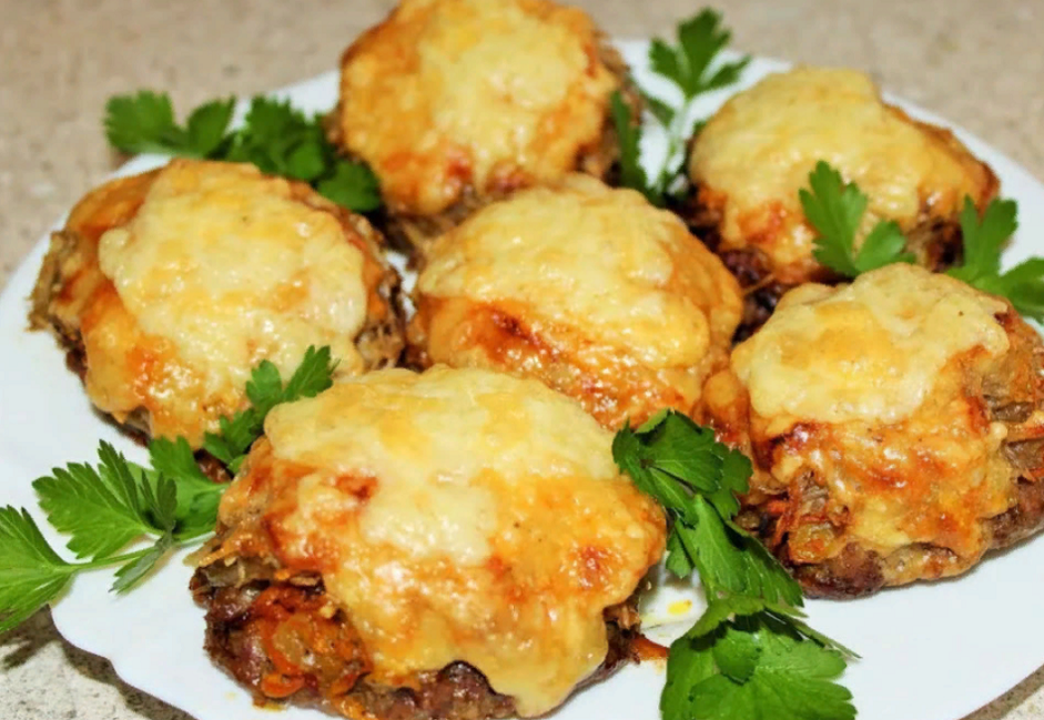 Фарш разделяем на шарики. Делаем из них лепешки (примерно 10 см). Перекладываем их в жаростойкую форму смазанную маслом. Сверху выкладываем пассированный лук с грибами.