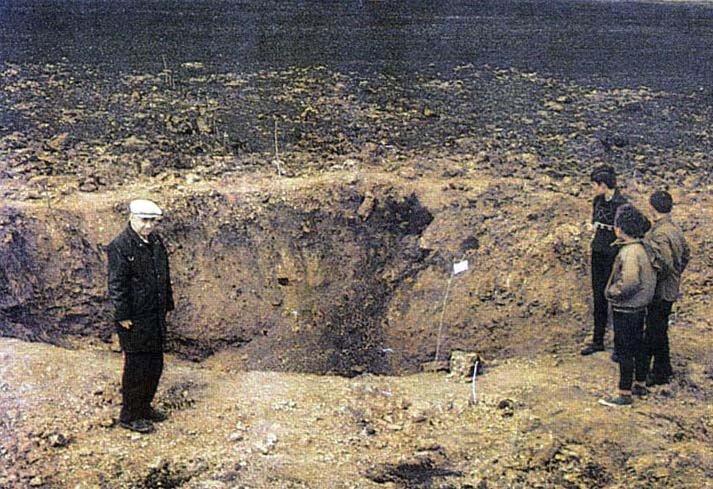 В первый раз мы, группа фотожурналистов, прибыли на поле уже через день после приземления метеорита. Была воронка метров шесть. Вокруг уже много наезжено, следы, естественно, вытоптаны. Там брызги отвердевшего металла собирали, видимо, на сувениры.