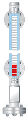 Поплавковый байпасный уровнемер УПБ 1015 (рис. 1) предназначен для указания уровня жидкости или границы раздела двух жидкостей в промышленных резервуарах. Использует принцип сообщающихся сосудов и не нуждается в электропитании. Поскольку байпасный уровнемер разработан для работы с агрессивными средами, он имеет специальную конструкцию, изолирующую индикатор уровня от среды. Байпасная (от англ. bypass – «обход») камера устанавливается сбоку от резервуара и изготавливается из материала, стойкого к коррозии. Внутри камеры находится поплавок с магнитной системой, формирующей фокусированное магнитное поле, он перемещается вверх и вниз в зависимости от наполненности резервуара (по принципу сообщающихся сосудов). Индикатор представляет собой роликовый указатель с двухцветными 10‑миллиметровыми роликами или флажками со встроенными магнитами. Под воздействием магнитного поля, созданного поплавком, они переворачиваются на 180 градусов, показывая положение поплавка изменением цвета и таким образом обеспечивая индикацию уровня жидкости в резервуаре. При повышении уровня цвет шкалы меняется с белого на красный, при понижении – с красного на белый.