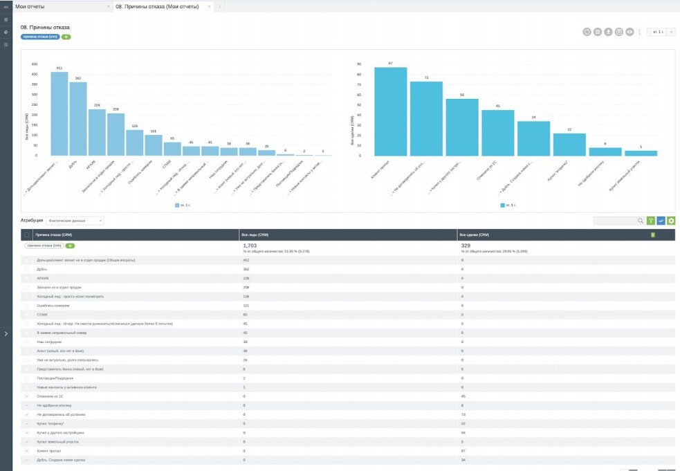 Данный отчет позволяет увидеть наиболее популярные причины забраковки лидов и причины отказа по сделкам