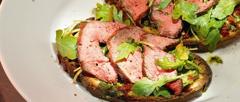 Ржаной хлеб (4 куска) , Вяленые помидоры (6 штук) , Рукола (40 г) , Песто (2 столовые ложки) , Говяжья вырезка (300 г) , Оливковое масло (80 мл) , Соль (по вкусу) , Свежий перец (по вкусу)