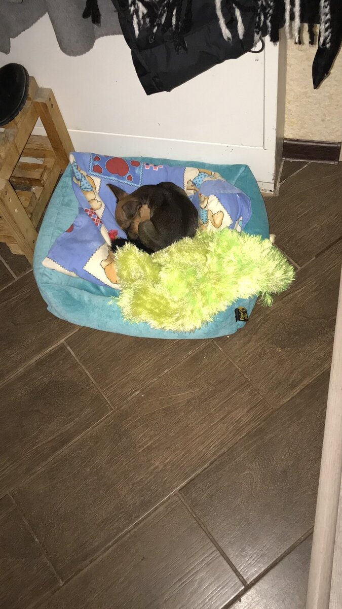 Когда он был ещё размером с ладошку спал в своей лежанке, но не всегда. Частенько засыпал на руках. Днем он спокойно укладывался на своем месте и лишь периодически выглядывал для успокоения своей души есть ли кто-то дома так как он категорически ненавидел оставаться один.