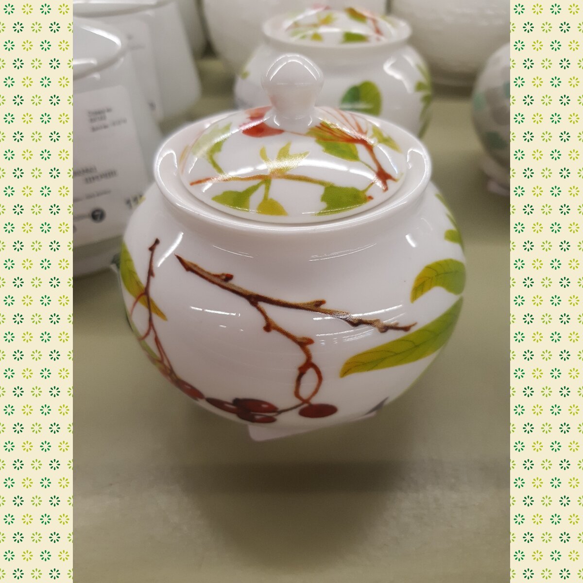 Расцветку описать сложно: вроде бы просто веточки, да листочки, но как освежающе смотрится этот салатовый цвет на белом фоне изделия. Такая сахарница точно сможет украсить собой любой стол или вашу кухню.