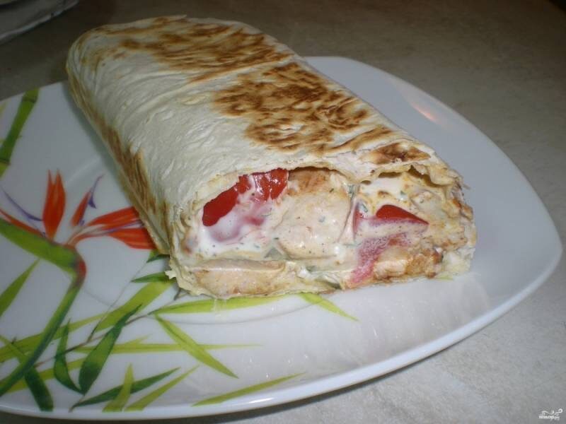 - Потом сделайте еще пару заворотов, чтобы продукты не просвечивали. Но не надо делать шаурму слишком толстой. Излишки лаваша обрежьте. Можете смазать тем же соусом лаваш в конце, чтобы скрепить шаурму.