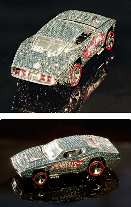 Изготовленный на заказ автомобиль был покрыт 18-каратным белым золотом, а затем покрыт 1388 синими бриллиантами, 988 черными бриллиантами, 319 белыми бриллиантами и 8 рубинами, в общей сложности около 23 каратных драгоценных камней стоимостью 140 000 долларов. Эта выставка была выставлена на специальной витрине, которая добавила еще 40 белых бриллиантов за каждый год истории горячего