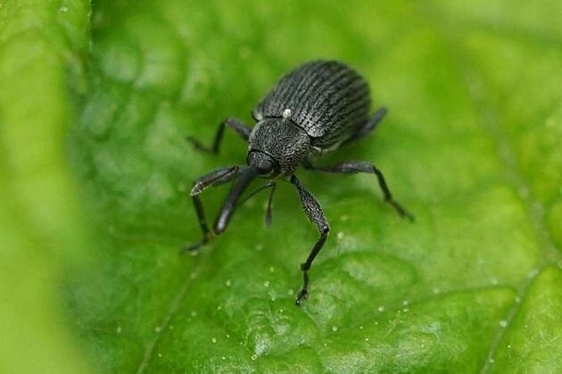 Да, действительно, на землянике во время цветения часто видны подгрызенные цветоножки, привядшие бутоны, поврежденные листья. Это “заслуга” землянично-малинного долгоносика (он не брезгует и малиной). Этот вредитель распространен повсюду, где выращивают вышеназванные культуры. Зимует он под мелкими комочками земли и опавшими листьями, а питаться, то есть повреждать растения, начинает, когда температура воздуха прогреется до 10–15о. Это очень маленький, до 3 мм, черный жучок, и рассмотреть его очень трудно.
