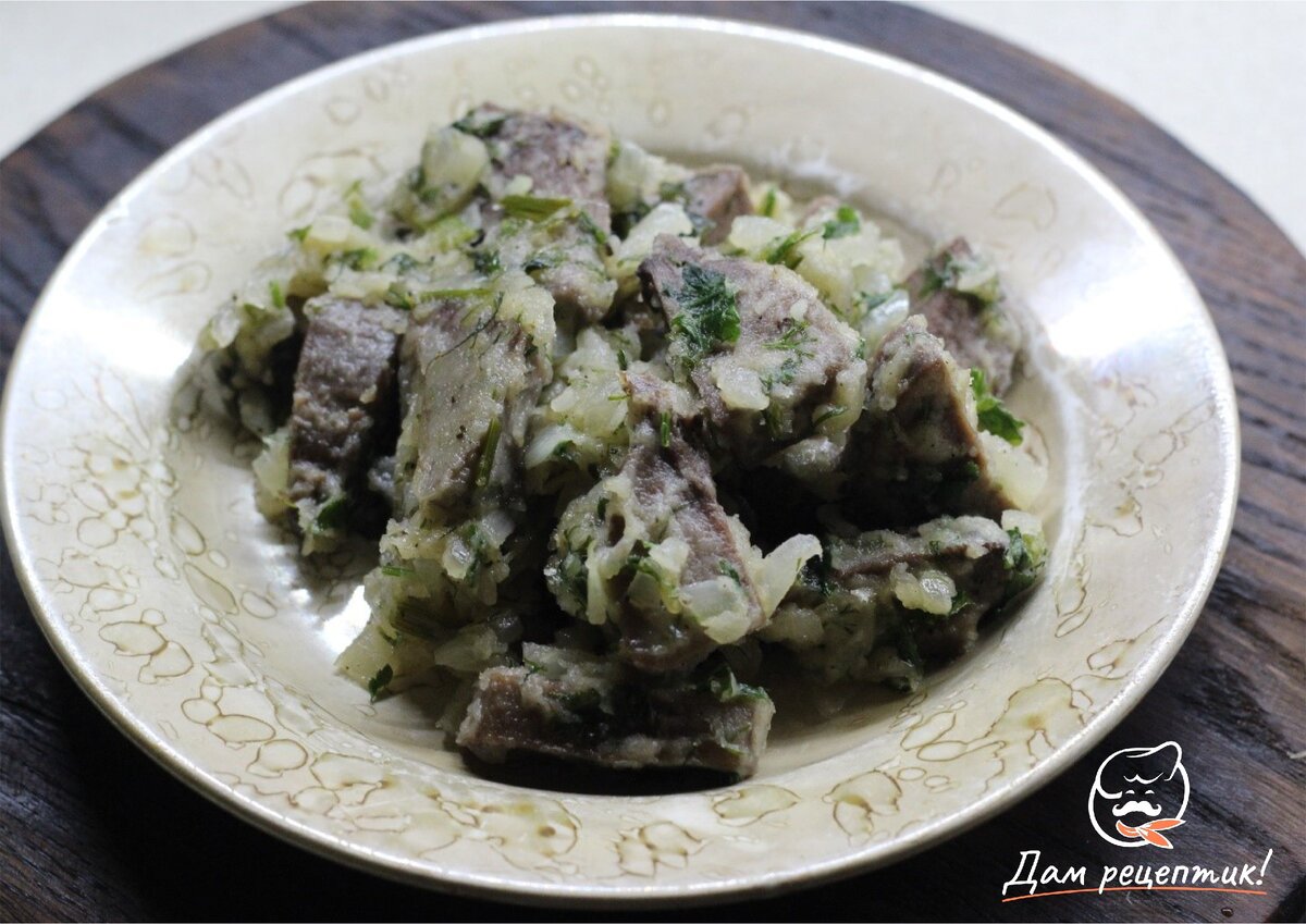 Отварной свиной язык нужно очистить от кожицы и нарезать на крупные слайсы. Добавить кусочки языка к луку. Обжаривать компоненты ещё несколько минут.