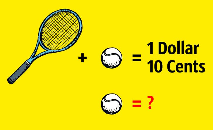 1. Ответ 5 центов. Если мяч стоит 10 центов, ракетка будет стоить 1 доллар 10 центов, в то время как именно столько стоят оба предмета вместе.
