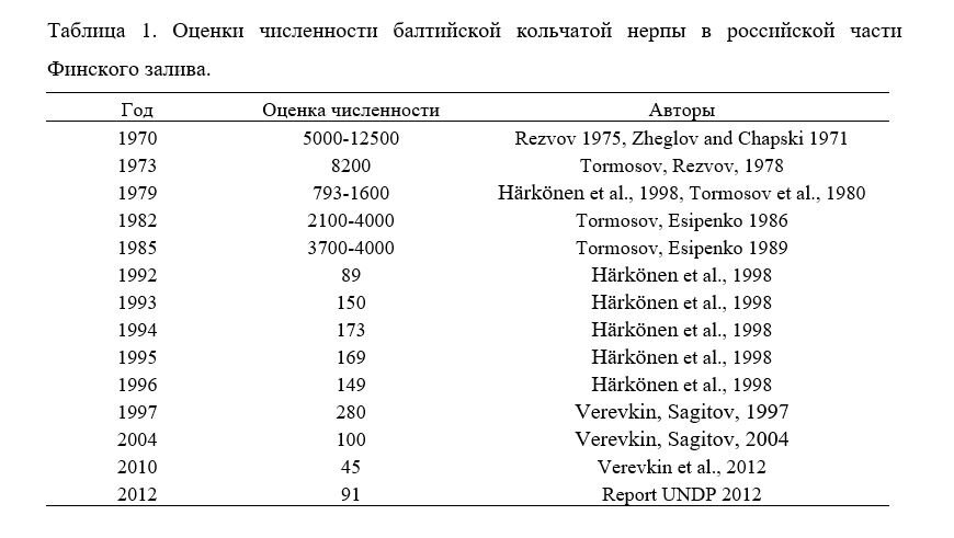 При этом нерпа разделена на три практически не пересекающиеся субпопуляции - и в современной России проживает всего одна, самая малочисленная. И та без преувеличения - катастрофически уменьшается. Если в конце 90-х максимальную численность субпопуляции кольчатой нерпы Финского залива оценивали в 300 голов, то сейчас эта оценка еще снизилась, и по мнению ученых в заливе вряд ли более 200 особей балтийской кольчатой нерпы. В отчете Балтийского Фонда 2013 года приводится следующая таблица, иллюстрирующая численность нерпы Финского залива