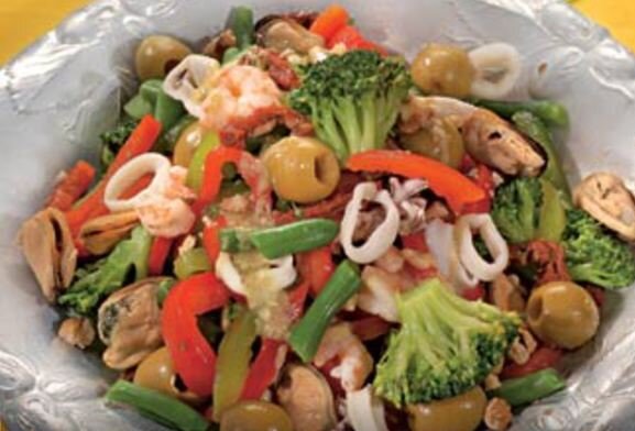Кипятим подсоленную воду, добавляем лимонный сок, высыпаем морепродукты и доводим до кипения и варим примерно 3-4 мин. Откидываем на дуршлаг и оставляем остывать. Стручки фасоли так же варим 5 минут и откидываем, после чего обжариваем в 1 ст.л. оливкового масла 3 минуты. Брокколи моем в холодной воде и делим на соцветия. В сотейнике кипятим подсоленную воду, добавляем брокколи и 1 ст.л. оливкового масла и варим примерно 3 минуты. Моем перец, выкладываем на противень и отправляем в духовку на 15 мин., она должна быть разогрета предварительно до 210 °С. Выкладываем, даём остыть и удаляем сердцевину и кожицу. Мякоть режим тонкими полосками. Для заправки в блендере взбиваем масло, перец, соль и лимонный сок. Выкладываем в салатницу брокколи, морепродукты, фасоль, перец и оливки. Раскладываем по тарелкам, посыпаем вялеными помидорами и грецкими орехами, поливаем заправкой.