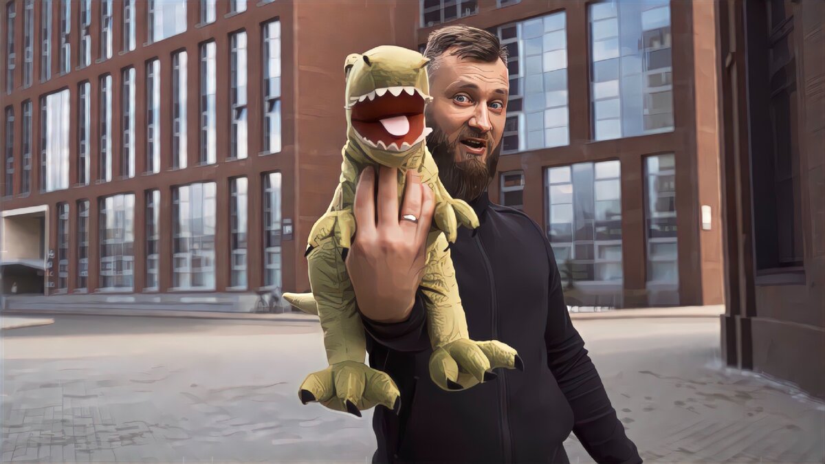 И, чтобы поддержать ваш энтузиазм, я вышел на улицу с гирей, в компании динозавра Ральфи. Сразу поясню, почему именно на улицу, с гирей и с динозавром.