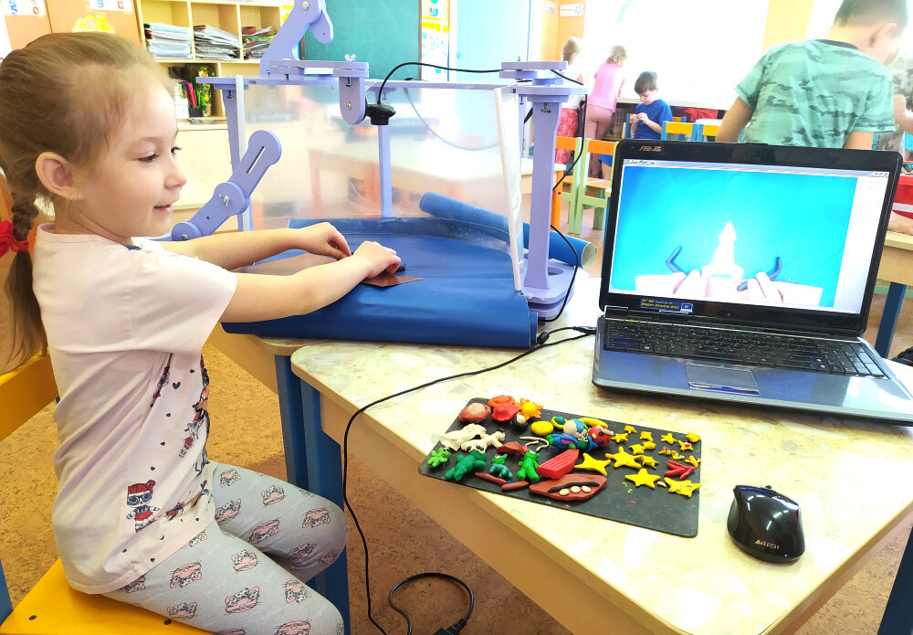 Для создания мультфильмов в детском саду приобретено профессиональное оборудование для детской мультипликационной анимации, которое включает в себя анимационный стол, фоновую подложку, микрофон, лампу для подсветки, веб-камеру, ноутбук. Сцена имеет своеобразную форму. Это позволяет аниматору более широко применять возможности съемочного пространства, воплощать на деле сложные, детально проработанные сюжеты при производстве покадровой анимации и аккумулирует в себе все необходимые инструменты для легкого создания качественной разноплановой мультипликации.