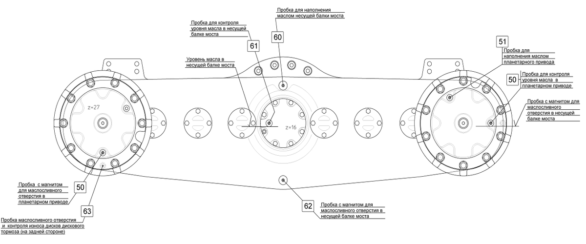 Производить замену нагретого масла одновременно с планетарным приводным механизмом. Тандемные коробки должны располагаться горизонтально. Очистить от грязи пробку маслозаливного отверстия (№ 60), пробку маслосливного отверстия (№ 62) и пробку для слива остатков масла (№ 63). Открутить пробки маслосливного отверстия (№ 62) (на каждом тандемном ящике по 2 пробки) и вылить все масло в подходящую емкость. Магнит на пробке маслосливного отверстия (№ 62) перед закручиванием очистить от мусора и стружки, пробку маслосливного отверстия (№ 62) закрутить так, чтобы не вытекало масло. Залить масло в соответствии с таблицей по смазочным материалам до уровня отверстия контроля масла (№ 60). Момент затяжки винта резьбовой пробки маслозаливного отверстия (№ 60) и пробки маслосливного отверстия (№ 62) – 70+10.