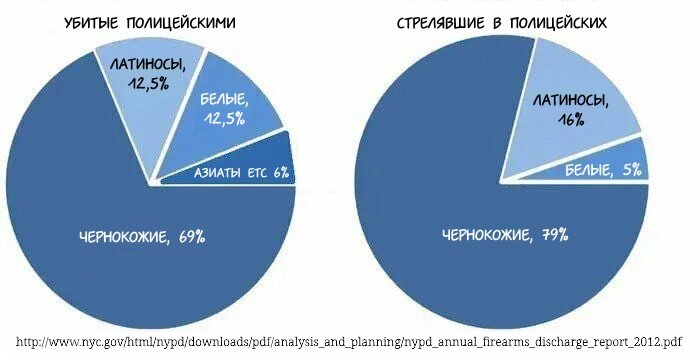 Несмотря на тот факт, что чернокожие совершают равное или большее количество насильственных преступлений, чем белые, вероятность быть застреленным при задержании у белого примерно вдвое выше, чем у чернокожего.