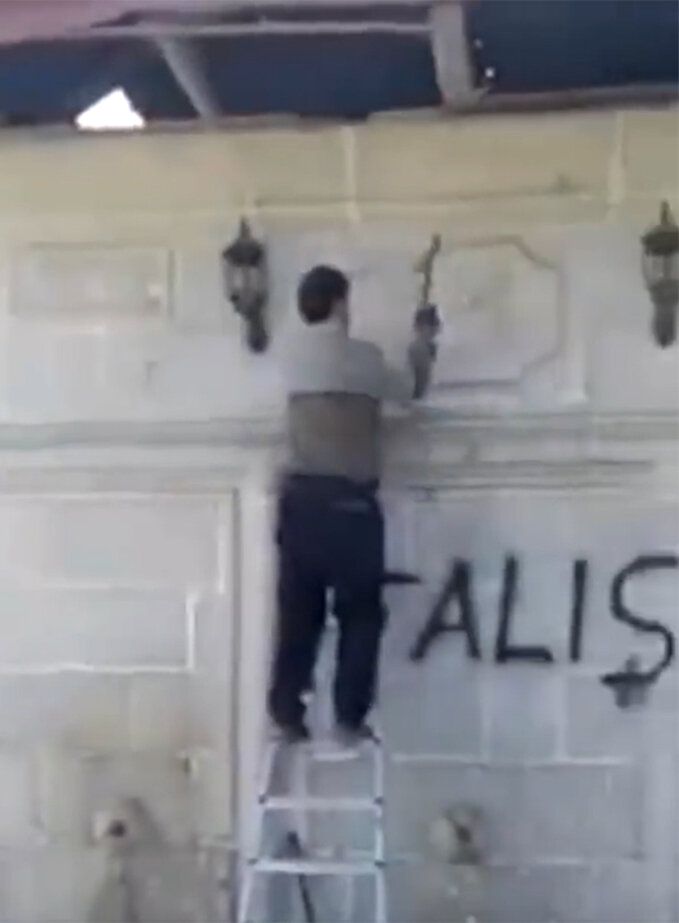 На кадрах видно, как рабочий топором сбивает со стен здания свидетельство принадлежности церкви армянской культуре.