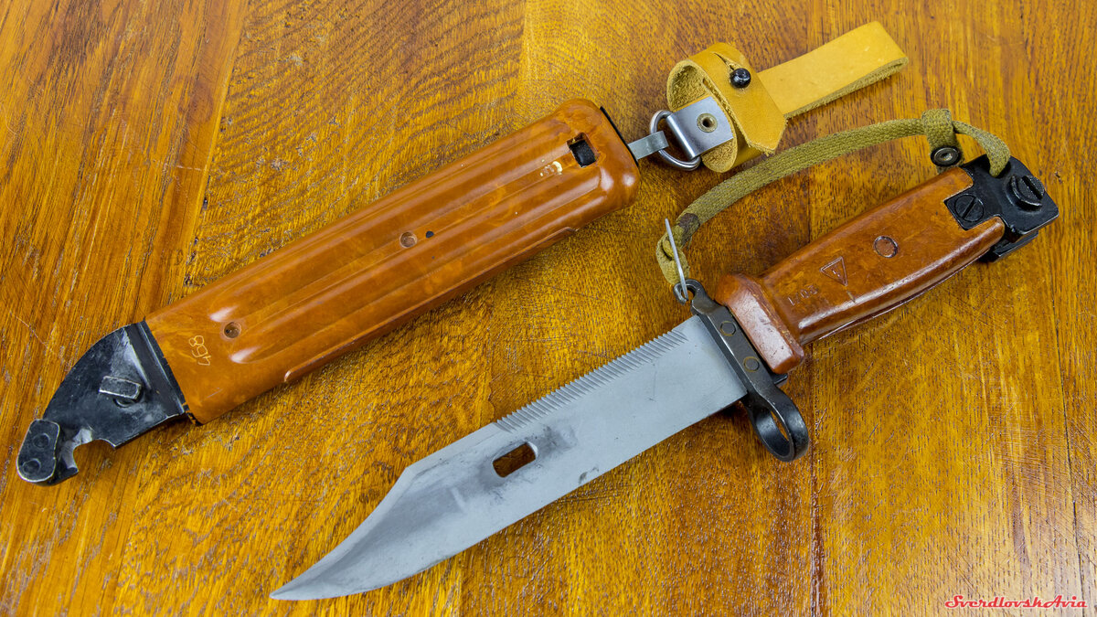 Штык-нож так же выпускался в Болгарии, ГДР, Египте, Ираке, Иране, Китае, Польше, Румынии и Югославии. Представленный на фото штык-нож не является холодным оружием - это "сувенирный нож", так как его клинок "отпущен" и твердость клинка менее 25 HRS и соответствует требованиям ГОСТ Р 51715-2001. Проволоку он уже не перекусит, а колбасу нарезать вполне реально! ))
