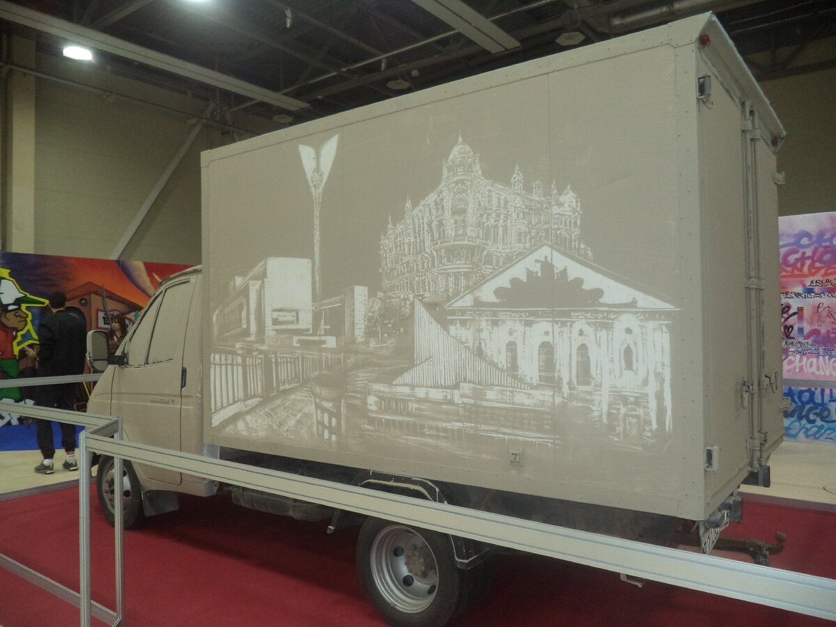 Необычным экспонатом выставки «Арт-Ростов» стала грязная машина с изображением достопримечательностей города.