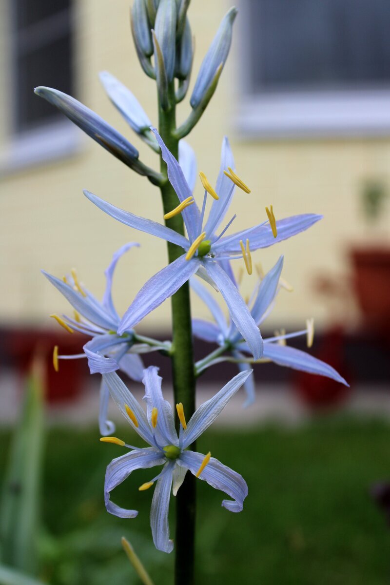 Камассия - зацветает в конце мая - июне, цветение продолжается около 10 дней. На цветоносе формируются до 30 цветочков с диаметром одного цветка 3-4 см, и длиною соцветия около 20 см. Горец стеблеобъемлющий или свечевидный - растение многолетнее высотой до 60 см., цветущее примерно с середины июля по конец сентября - начало октября. Цветонос длиною до 30 см на конце которого находятся мелкие, плотно прижатые цветочки, собранные в соцветие длиной до 15 см. Физостегия - многолетнее, неприхотливое растение высотой около 70 см, цветущее ориентировочно в конце июля - августе до 50 дней. Длина соцветия физостегии может быть до 30 см. Астильба - неприхотливое многолетнее растение с декоративной листвой и яркими цветоносами метёлками высотой до 1 метра, цветущее в начале июля ориентировочно до 35 дней. Длина соцветия может быть до 25 см. Дицентра исключительная - растение с резными листочками, напоминающими маленький папоротничек, и цветоносами высотой не больше 30 см и длиной соцветия до 15 с
