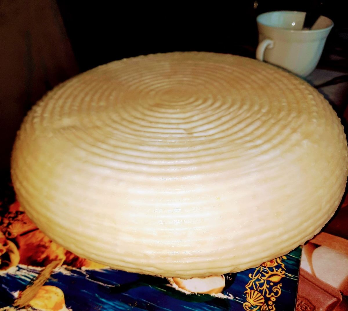 Вот такой сыр она делает для себя. Тут примерно 2.5 кг. На эту головку сыра ушло 18 литров молока, плюс закваска. Дальше вызревание и время.