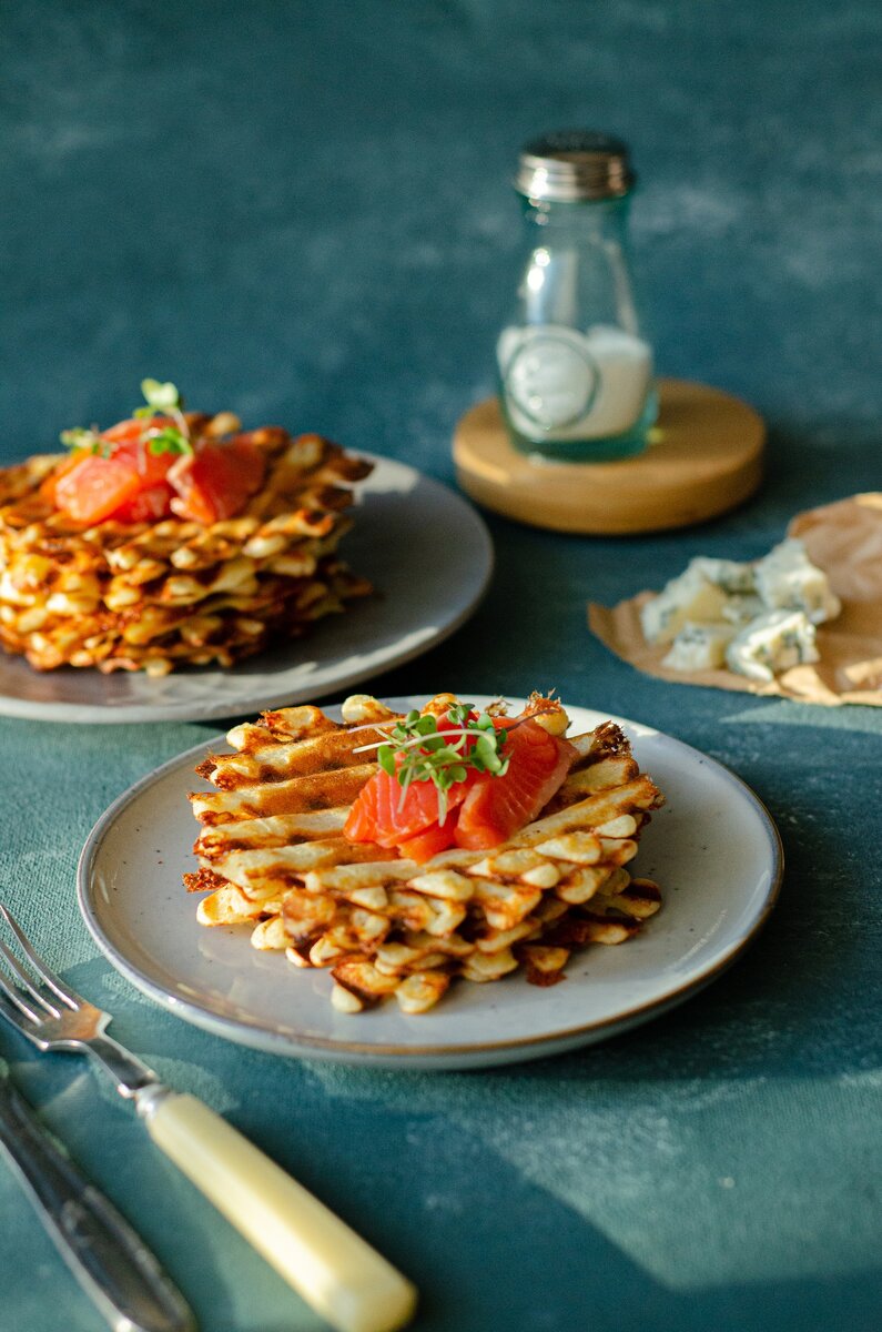 Сырные вафли на сыре с голубой плесенью. С солёной рыбой и микрозеленью.