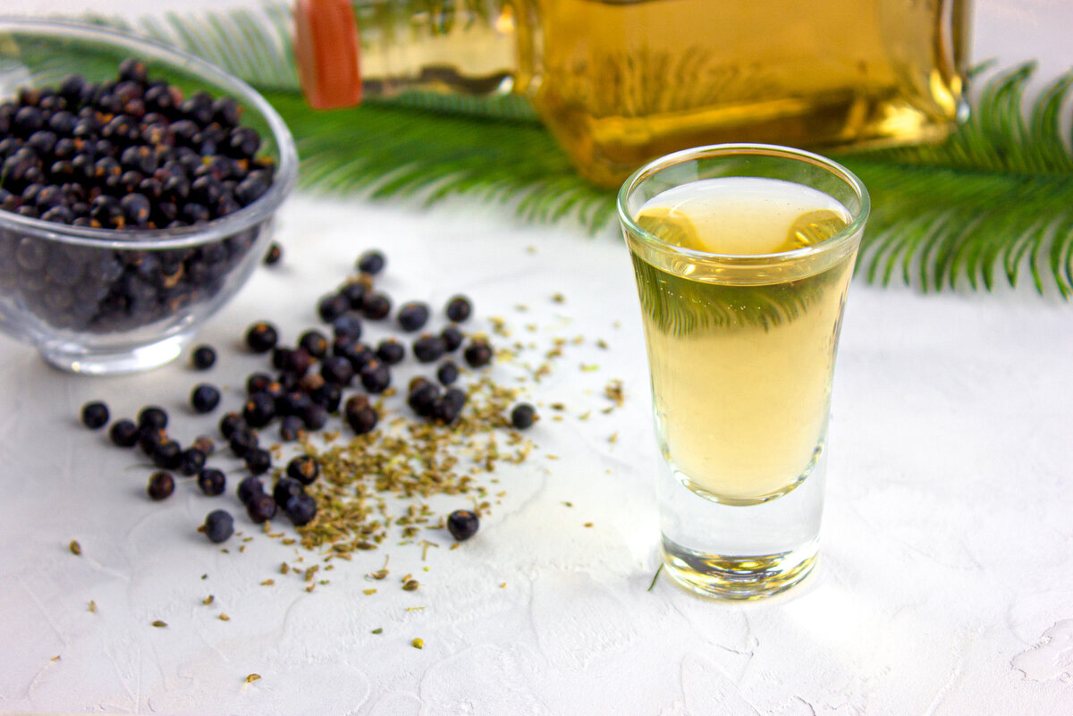 Залейте 30 грамм ягод можжевельника 300 мл спирта крепостью не ниже 70%. Выдержите настой в течение 14 дней. Затем разбавьте настойку водой до крепости 20% и проведите простую перегонку.