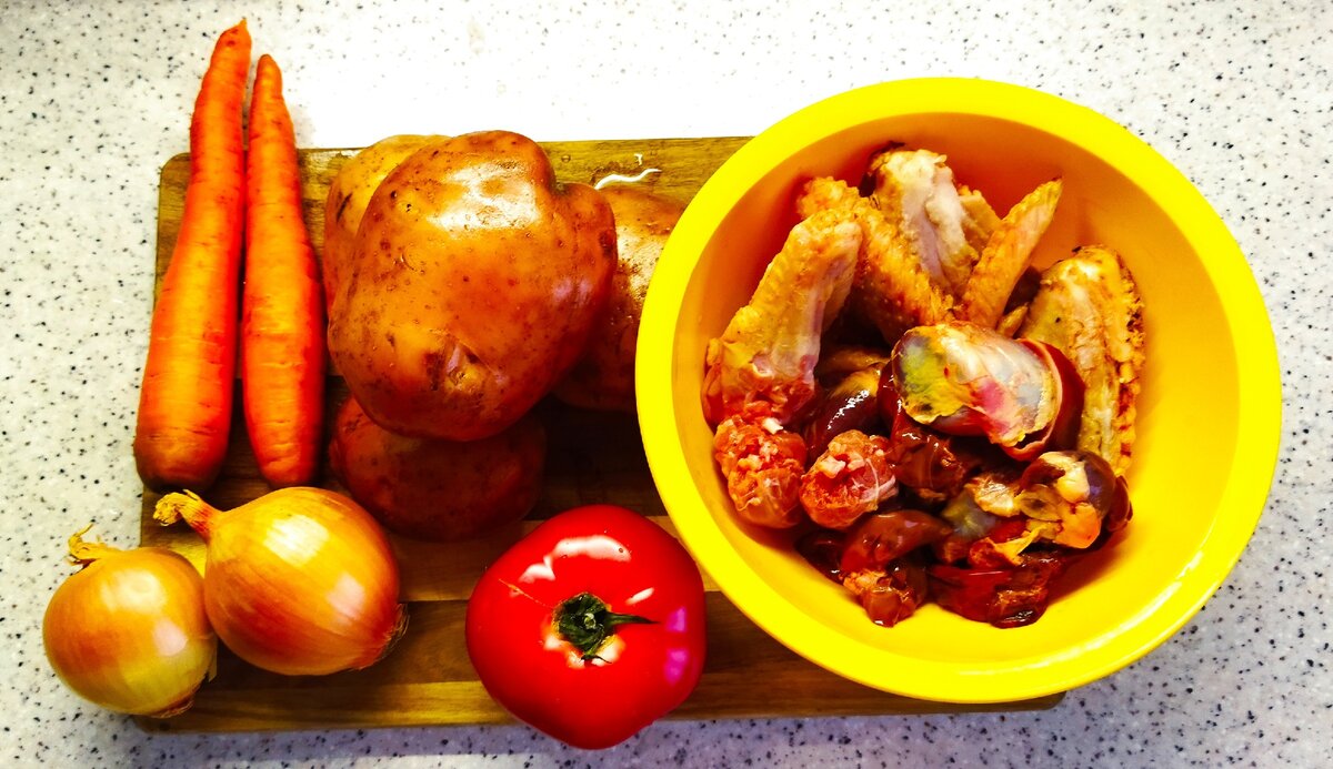 Потроха, крылья и шеи нарежьте на небольшие кусочки и уложите в горшок. Налейте столовую ложку масла. Измельчите специи в ступке или используйте молотые. Перец и лавровый лист не используйте, их черёд ещё не пришёл.