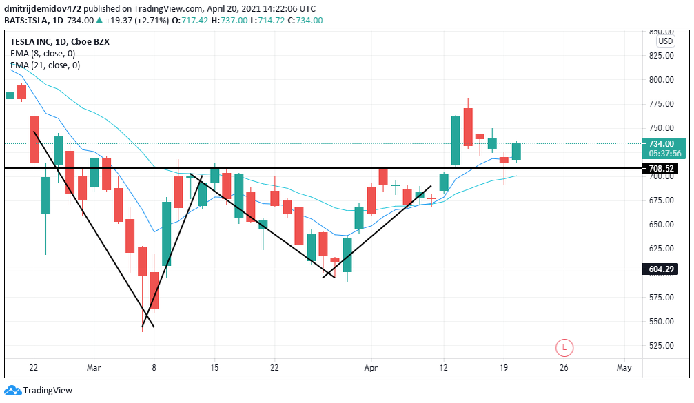 В итоге с Теслой у нас есть фигура «Двойное дно», общее направление тенденции совпадает и есть еще пинбар возле уровня поддержки. Очень много факторов, которые говорят в пользу роста этих акций и я уверен, что здесь стоит входить. Стоп лосс можно переместить за тень пинбара, что тем, кто входил на фигуре, что тем, кто будет входить сейчас.