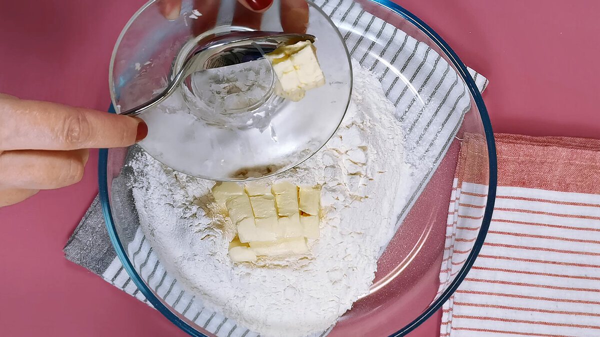 Просеять муку и выложить в него нарезанное на небольшие кусочки сливочное масло. Масло должно быть обязательно холодным.