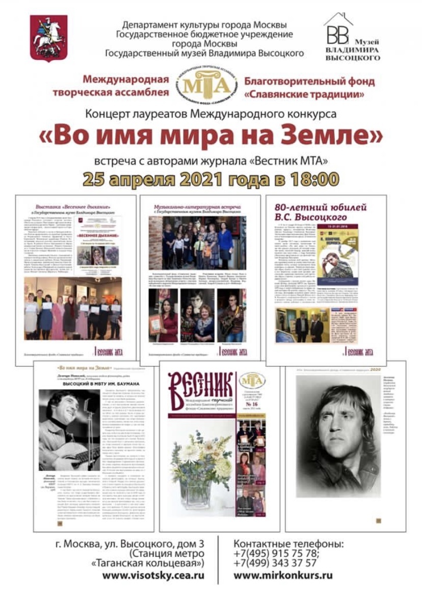 Друзья, спешу сообщить, что совсем скоро состоится встреча участников международного проекта «Во имя мира на земле». Здесь будут представлены книги и журналы которые выпускает благотворительный фонд «Славянские традиции». Совместно с музеем Высоцкого прошло уже более 30 мероприятий . А именно 17 тематических выставок, 2 музыкально-литературные встречи и онлайн мероприятия.