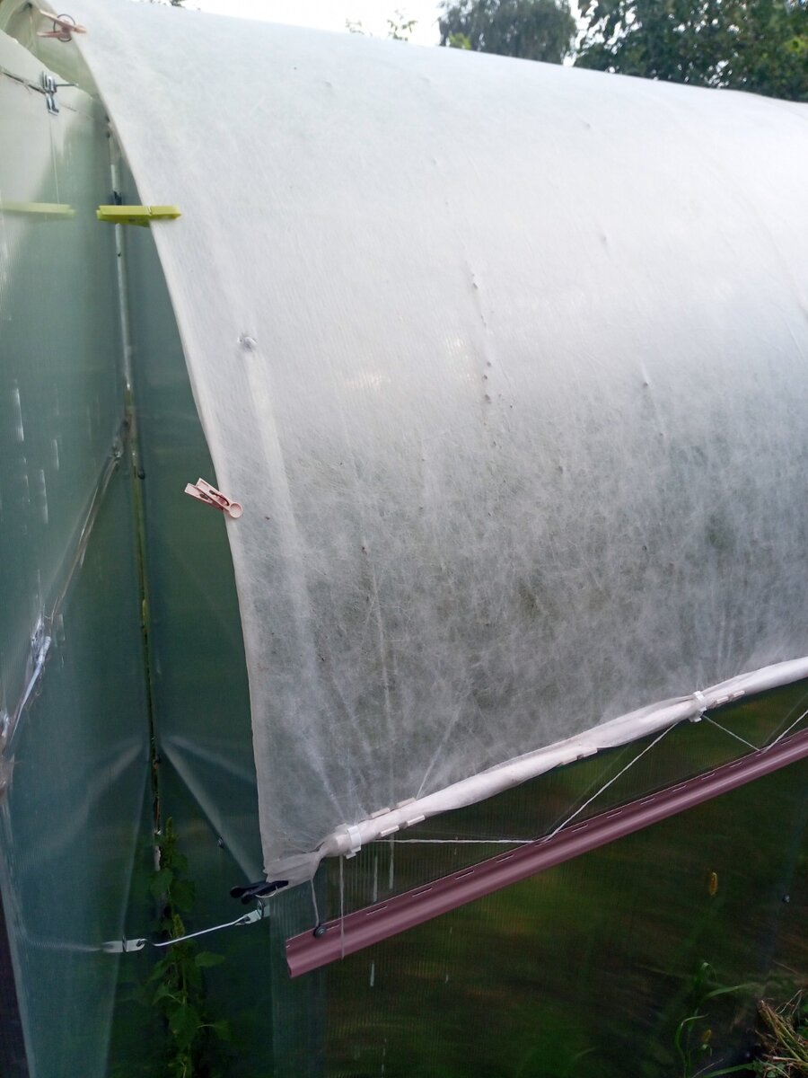 Обрезки сайдинга были закреплены в те же места, что и полипропилен при его монтаже, тем же саморезом, остатки п/п труб спаяны муфтами до общей длины 4 м. (два таких отрезка с каждой стороны теплицы), на эти трубы был просто накручен укрывной материал и зафиксирован клипсами, а вся эта конструкция была размещена на крыше теплицы, а синтетическим шпагатом привязана к сайдингу, как можно увидеть на фото. С торцов укрывной материал был просто подвёрнут и закреплён обычными бельевыми прищепками.