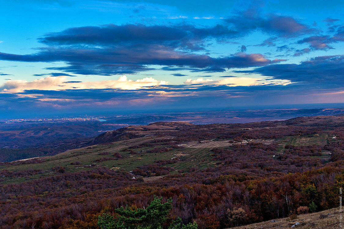 Виды с горы открываются в это время суток неплохие, но немного однообразные. На юге видно море и Алушту.
