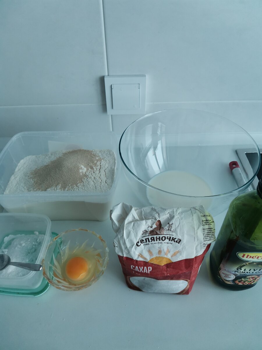 Смешиваем муку и дрожжи. Молоко подогреваем и добавляем 1 яйцо. Перемешиваем. Затем смесь муки и дрожжей. Далее соль и масло. Перемешиваем.