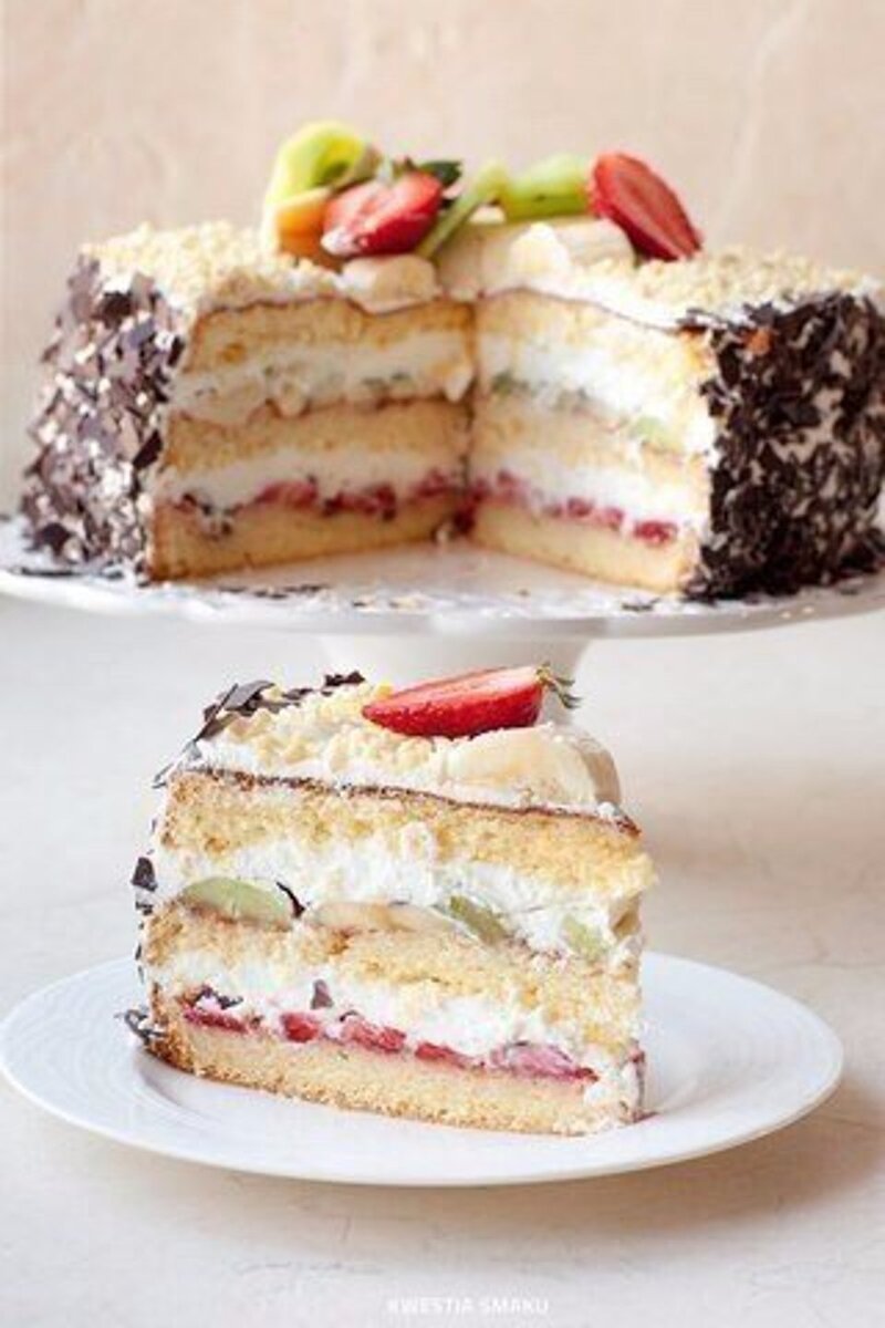 Готовим крем: Поместить в холодную чашу миксера все продукты для крема и взбить в течении 3-4 минут, пока смесь не станет плотной. Сборка торта: Бисквит остудить и оставить его на сутки. Нарезать на 3 части и пропитать чаем каждый корж. Промазать тонким слоем варенья. Выложить тонко нарезанные фрукты, затем 1/3 часть крема. Повторить все тоже самое с остальными коржами. Украсьте торт по своему желанию.