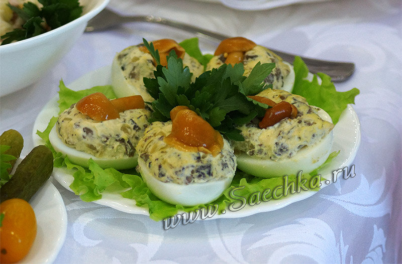 - Выложить начинку на половинки яиц, по желанию украсить зеленью и грибами.
