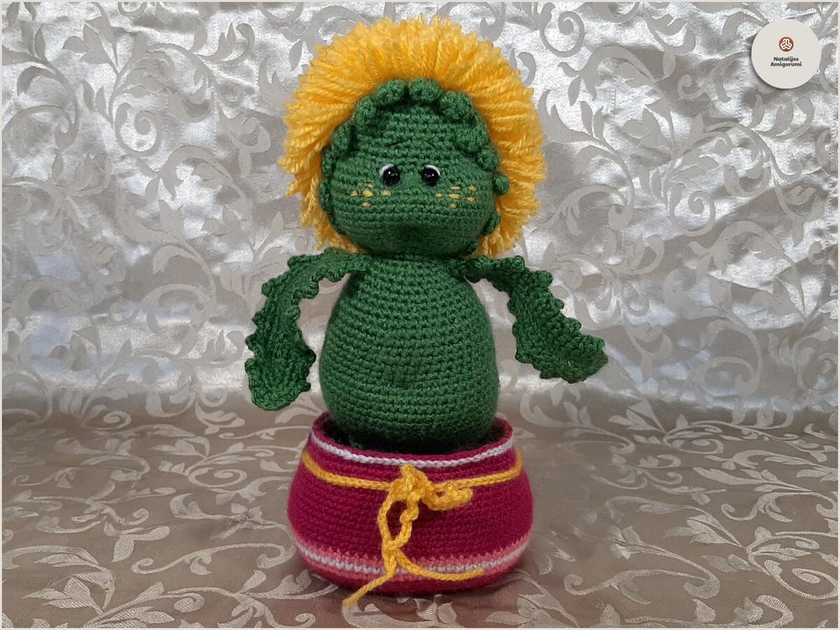 Яркий вязаный горшочек с имитацией земли внутри.