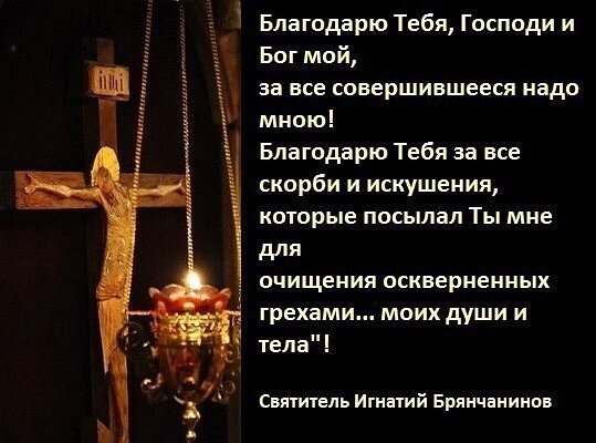 Слава Богу за все. Слава Богу, что создал меня по образу Своему и подобию. Слава Богу, что меня, падшего, искупил! Слава Богу, что обо мне, недостойном, промышлял! Слава Богу, что меня, согрешившего, в покаяние призвал!
