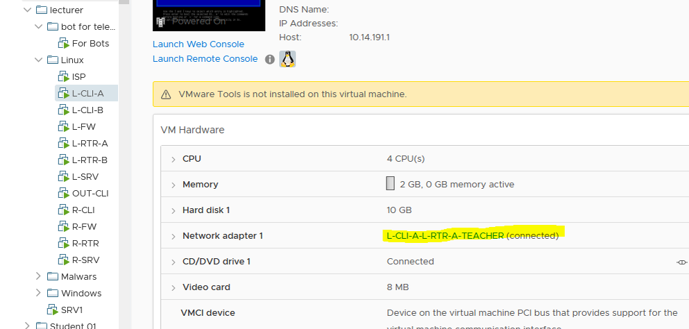 Есть маленький нюанс. Мы имеем интерфейсы созданные в программе виртуализации, но мы не знаем их название в самой виртуальной машине. Советую вам посмотреть связность интерфейса. У меня это например одинаковые названия на соединении двух ВМ. Проверяем MAC