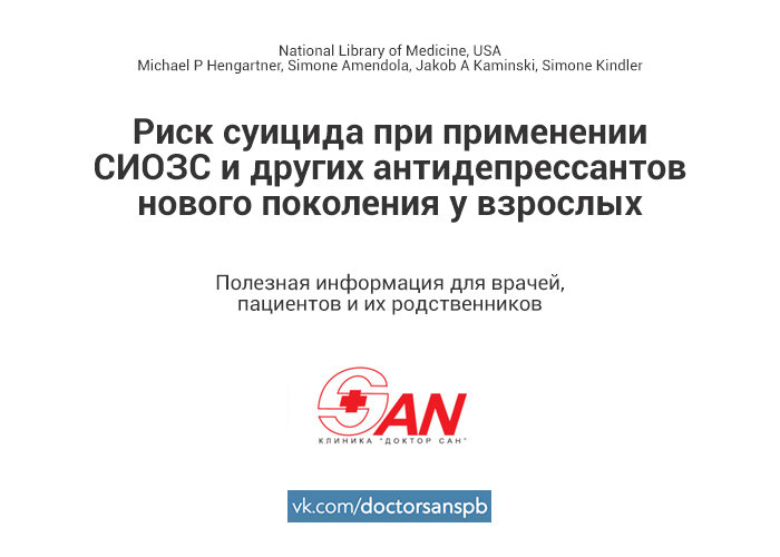 Систематический обзор включал 27 исследований. СИОЗС не были однозначно связаны с риском суицида (самоубийство и суицидальная попытка вместе) при депрессии и по иным показаниям. Любой антидепрессант нового поколения был связан с более высоким риском суицида при депрессии и по иным показаниям. Предвзятость публикаций и финансовый конфликт интересов, вероятно, способствуют систематической недооценке риска в опубликованной литературе. Источник: https://pubmed.ncbi.nlm.nih.gov/33685964/ Подробнее об антидепрессантах: https://doctorsan.ru/antidepressanti