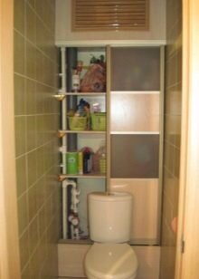 Туалет со шкафом можно считать своего рода кладовкой для хранения вещей. Цена на готовое изделие в магазине может быть значительной, поэтому проще сделать фасад и каркас самостоятельно. Таким образом, в нише можно повесить полки и скрыть их от глаз с помощью дверцы.
