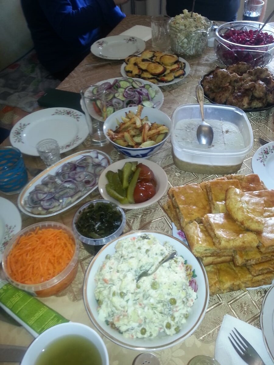 Наш стол отличался большим разнообразием закусок, салатов и пирогов.