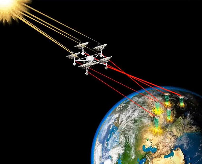 Еще одна необходимая технология – это ретрансляция мощных лазерных пучков. Суть идеи применительно, например, к снабжению энергией спутников в том, что проходящий с Земли через тропосферу по кратчайшему маршруту луч корректируется методом адаптивной оптики, а затем передается на воздушную платформу (аэростат или беспилотник), откуда ретранслируется по стратосферным и космическим магистралям практически без потерь и искажений на расстояния в тысячи километров.