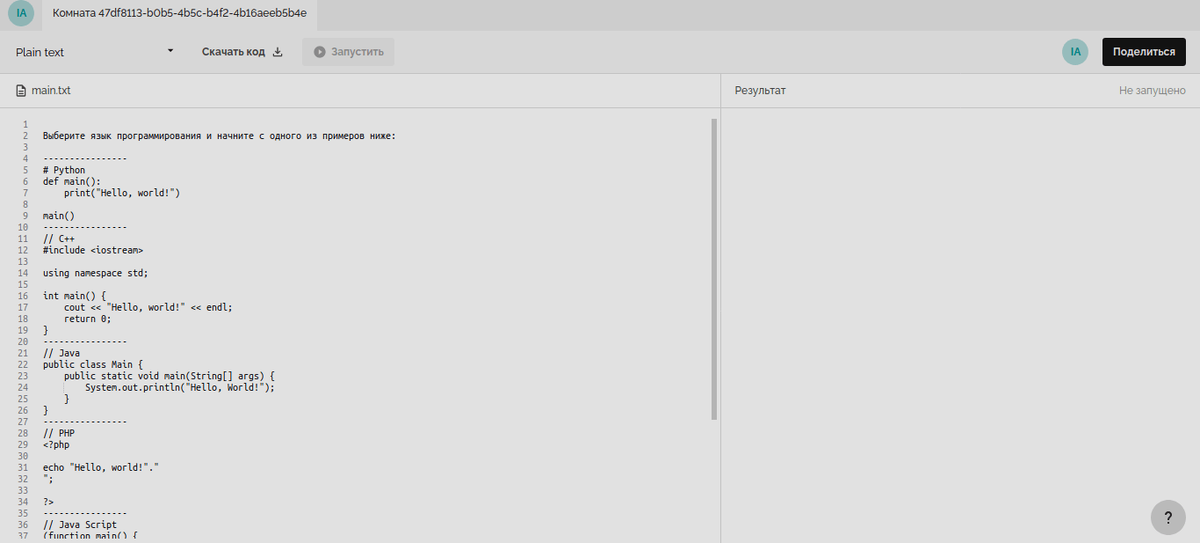 При совместной работе над кодом в комнате будет сохраняться проделанная работа на сервере компании и синхронизироваться с работой всех участников, которые добавлены в одну комнату. При этом, всем участникам будет доступен просмотр работы других участников в реальном времени. Чтобы посмотреть результат запуска кода, участнику придется самому совершить запуск, так как результат будет виден только у каждого участника по отдельности.