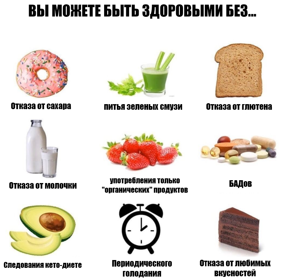 Это абсолютное безумие, и если слушать каждого подобного зожника, сыроеда и фанатика определенного типа диет, остается питаться солнечными лучами. Всё запрещено, всё вредно.
