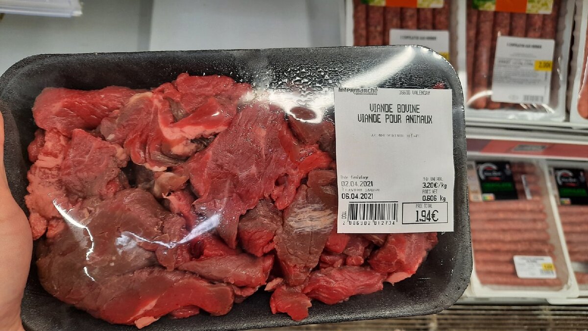 А не перестаю удивляться новым находкам в супермаркетах Франции. Вчера, рассматривая витрину с мясом наткнулась вот на такую упаковку. Думаю, дешево для говядины. Но на гуляшь очень даже сойдет. Мясо хорошее, но три евро за 1 килограмм, я такого даже на скидках не видела. Решила все таки заглянуть в переводчик и вот что он мне говорит: "мясо для животных".