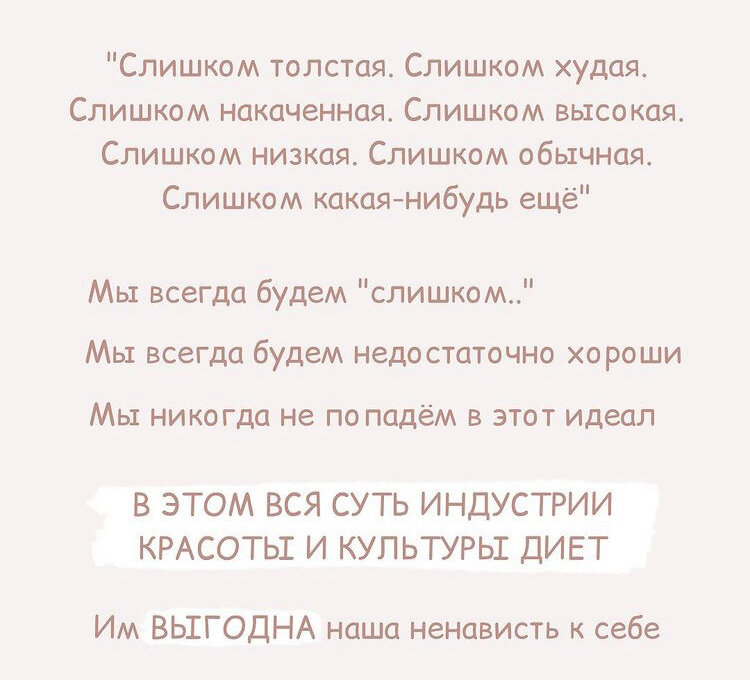 Сейчас все загружены похудением к лету. Кричащие заголовки о похудение, НИЗКОКАЛОРИЙНЫЕ продукты, блогеры продающие чек-листы и обучения о правильном питании и тренировках и многое другое. Этим людям выгодна наша ненависть к себе. Всей индустрии красоты
