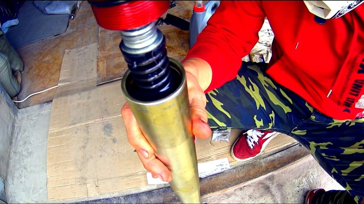 Открутив пробки на обоих ногах, НЕ СЛИВАЯ МАСЛА вытаскиваем проставки (тонкие трубки, если они есть) и пружины, не потеряйте шайбы которые стоят между ними!