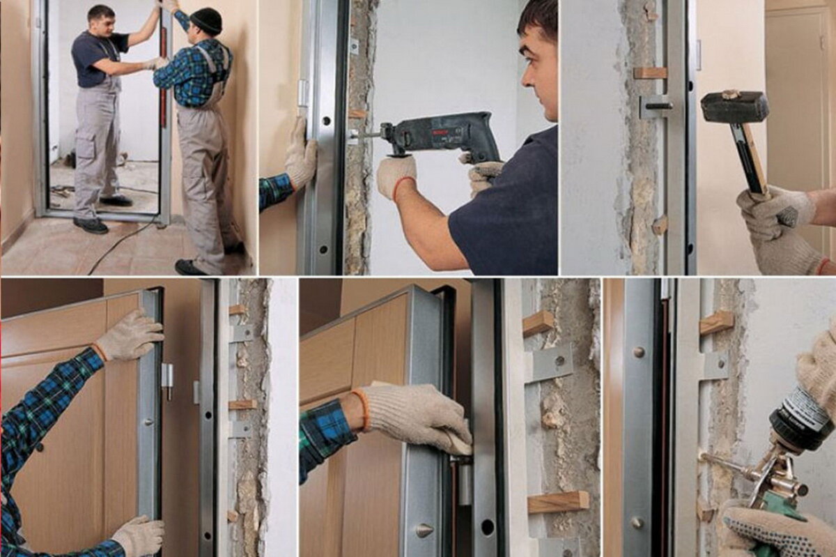 Они позволят выставить правильно монтируемую дверь. Снять новую дверь с петель. Проверить, как вставляется новая коробка в дверной проем. Под низ коробки с петлевой стороны подложить сантиметровую подкладку. Это даст необходимую свободу перемещения коробки при регулировке по высоте. С помощью деревянных клинов закрепить равномерно верхнюю часть коробки так, чтобы петлевая и замковая стороны не выступали за уровень стены, как снаружи, так и внутри комнаты. С помощью профессионального строительного уровня или отвеса выставить петлевой стояк коробки в двух плоскостях и клинами закрепить нижнюю часть петлевого стояка. Нельзя использовать повсеместно продаваемые уровни 60 и метровой длины. Они для «клиентов» и показывают то, что выгодно, а не то, что есть на самом деле. Лучше использовать , как минимум полутораметровый уровень с хорошей градацией делений или двухметровый уровень. Настоящие профессионалы работают только с отвесом. Здесь получаются самые лучшие результаты.
