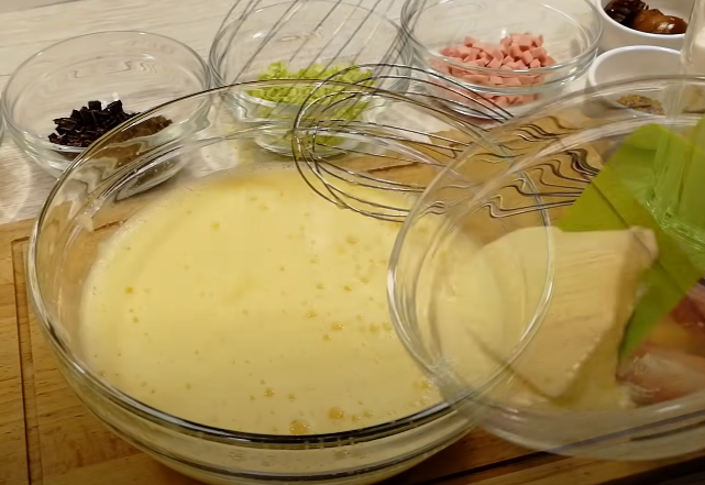 После этого добавить минеральную воду и взбитые белки. Далее в тесто можно добавить самую разнообразную начинку.