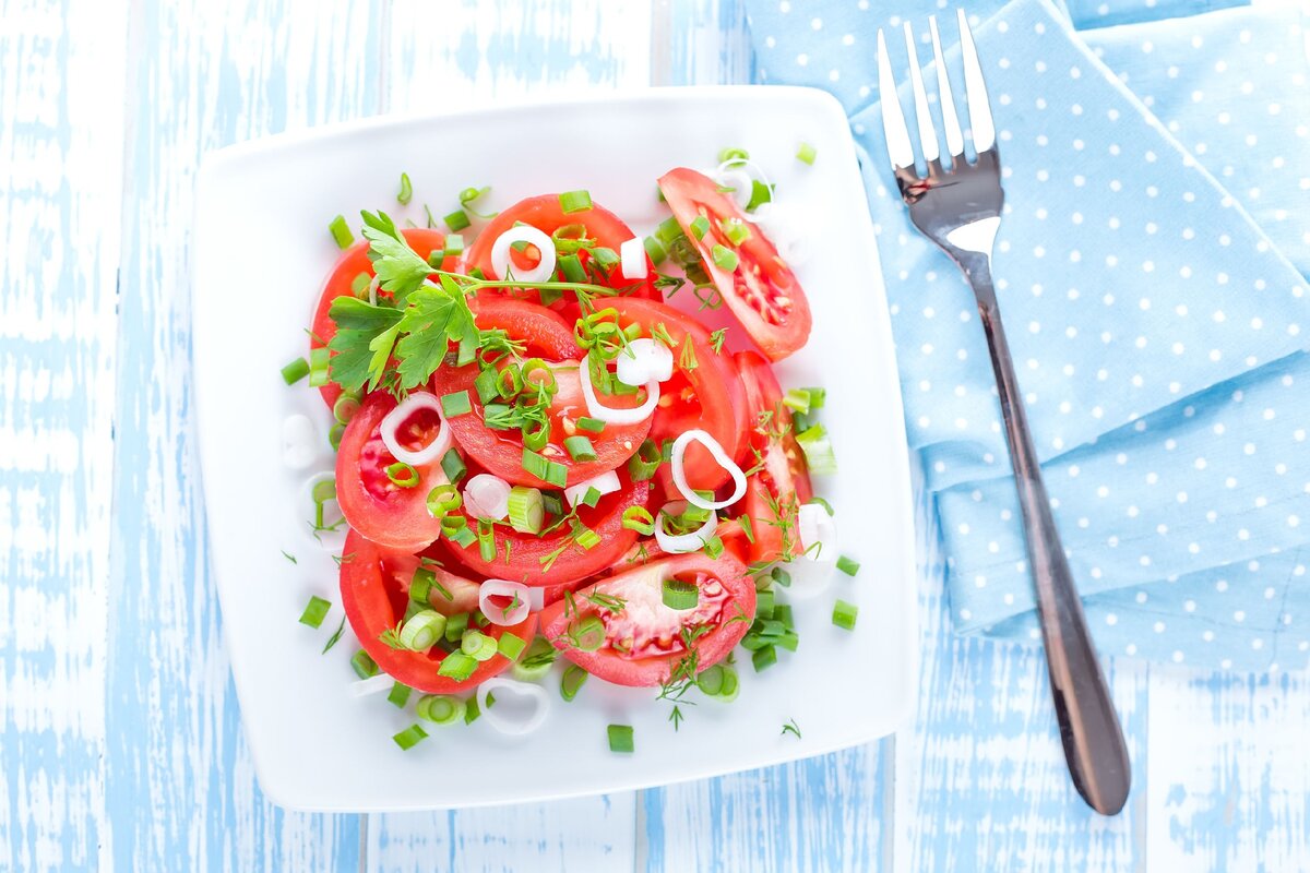 Особое внимание стоит уделить высокой пищевой ценности закуски. Салат полезный. Его можно включать в рацион довольно часто. Помидоры являются источником ценного антиоксиданта – ликопина, который помогает исключить заболевания сердца. Большее количество вещества находится в спелых томатах и кожице, поэтому ее не рекомендуется счищать! Репчатый лук известен своими бактерицидными и противовирусными свойствами. Он отлично борется с различными инфекциями, укрепляет иммунитет и помогает поддержать здоровье в сезон простуд. Перед включением в состав лука, его следует обязательно попробовать. Если он резкий, то его можно замариновать!